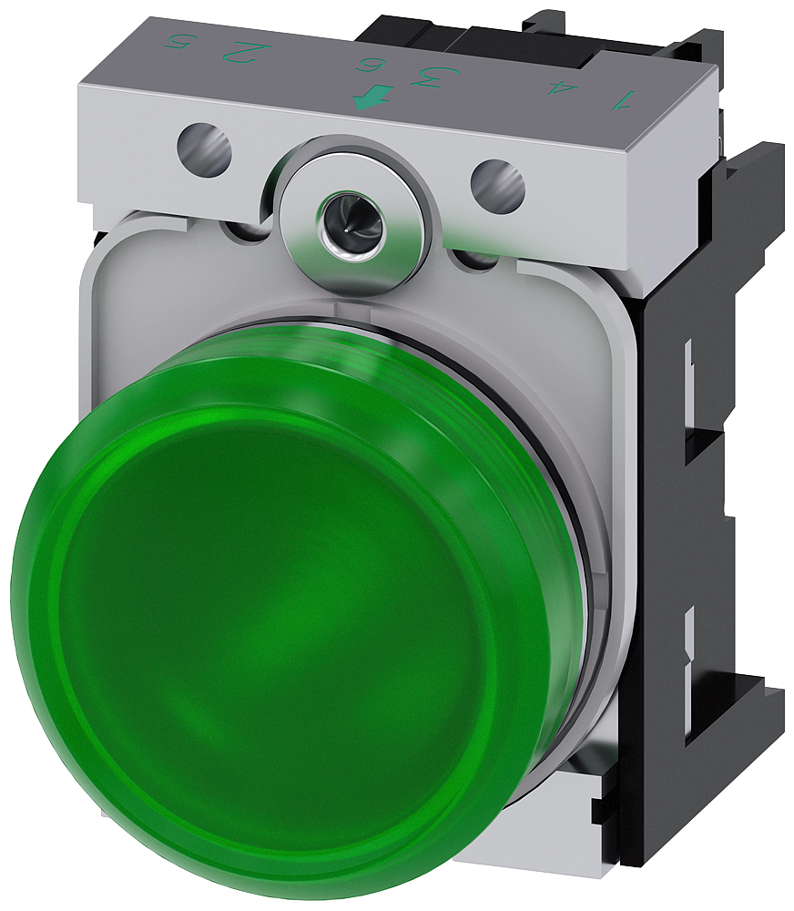 This is SIRIUS ACT front panel mounting Green LED Indicator 22.3mm Cutout IP66 IP67 IP69(IP69K) Round manufactured by Siemens. The manufacturer part number is 3SU1153-6AA40-1AA0. The product is available in panel mount configuration. Moreover, the product has a nominal 110v ac voltage rating. The product sirius act, is a highly preferred choice for users. The product's body is nicely designed from metal materials. It is a type of led lamp.