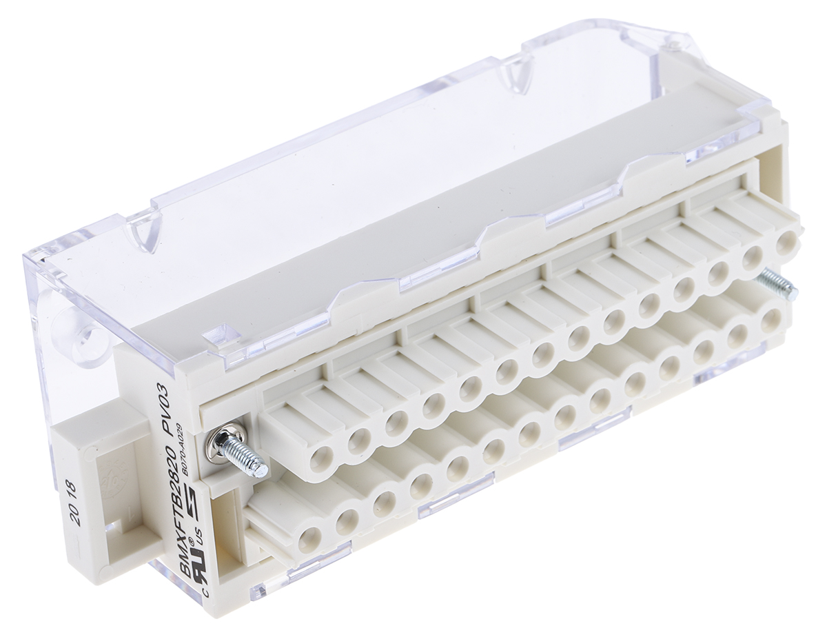 This is Terminal Block for use with Modicon M340 manufactured by Schneider Electric. The manufacturer part number is BMXFTB2820. It is a type of terminal block accessory.