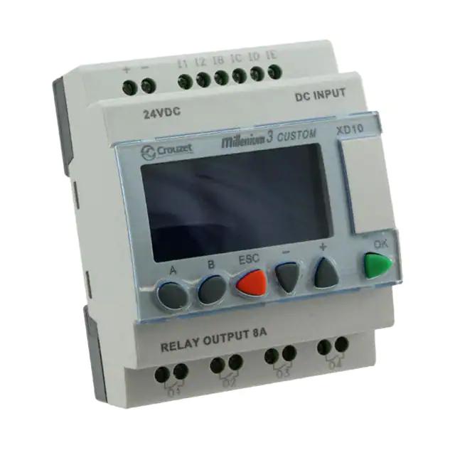 This is XD10 Logic Control With Display Serial USB Communication 2 Port 6 x Input 4 x Output manufactured by Crouzet. The manufacturer part number is 88974141. Additionally, the product is supplied with 4 outputs. The product is available in din rail configuration. Furthermore, it has arelay output. It carries analogue, digital input type. It has a maximum operating temperature of +55°c. Whereas, the minimum operating temperature of the product is -20°c. The product consists of 6 inputs. It is assigned with possible HTSUS value of 8537.10.9170. The product is rohs compliant. Number and outputs type - 4 - relay. The product has -20°c ~ 70°c operating temperature range. It holds a typical memory size of 368 bits/200 words. It is approved by ce, csa, gl, ul. The product is available in chassis mount, din rail configuration. Features 18, 18, 18, 18 characters per row. In addition, it is reach unaffected. It is shipped in box. Its typical moisture sensitivity level is 1 (unlimited). It has a long 3 weeks standard lead time. It features a remarkable lcd - black characters, green backlight display. It is IP rated with ip40. The splendid features of the product include battery backup (lithium). Inputs and Type of Inputs - 6 - digital (2), analog/digital (4). The product millenium 3, xd10, is a highly preferred choice for users. It has optimum voltage supply of 24vdc. The product is designated with the ear99 code number
