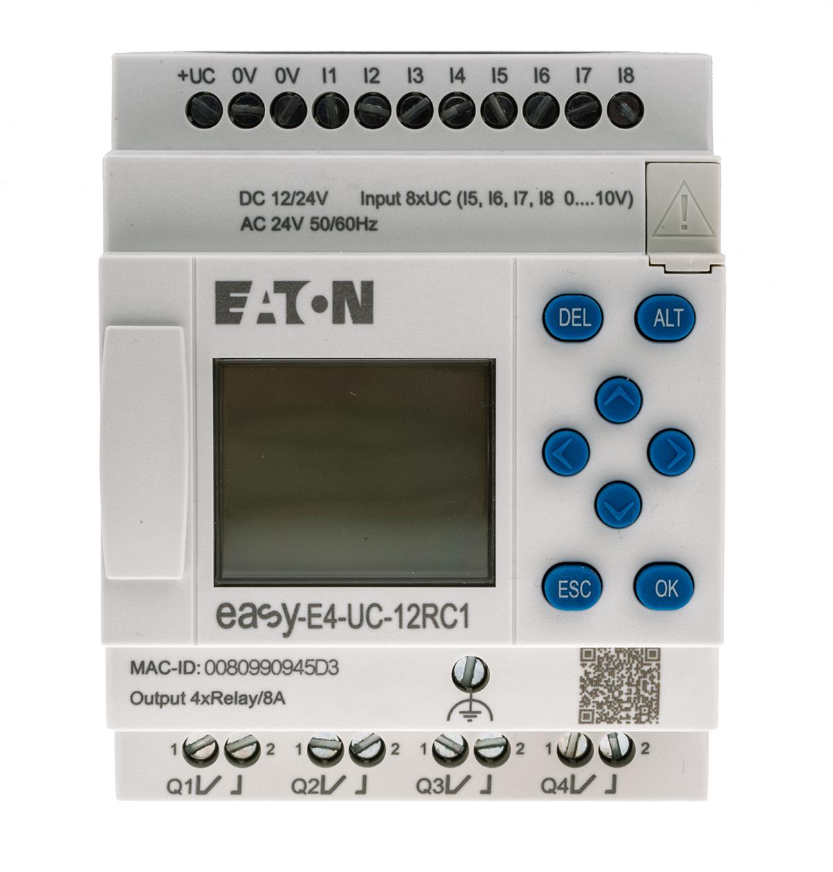 This is easy Logic Module - 4 (Analogue) 8 (Digital) Inputs 4 Outputs Relay For Use With easyE4 Ethernet Networking manufactured by Eaton. The manufacturer part number is 197211 EASY-E4-UC-12RC1. Additionally, the product is supplied with 4 outputs. The given dimensions of the product include 71.5 x 58 x 90 mm. The product consists of 4 (analogue), 8 (digital) inputs. Its accurate length is 71.5mm. Furthermore, it has arelay output. Furthermore, the product is 58mm wide. The product comes in 90mm depth. It carries analogue, digital input type. It has a maximum operating temperature of +55°c. Whereas, the minimum operating temperature of the product is -25°c.