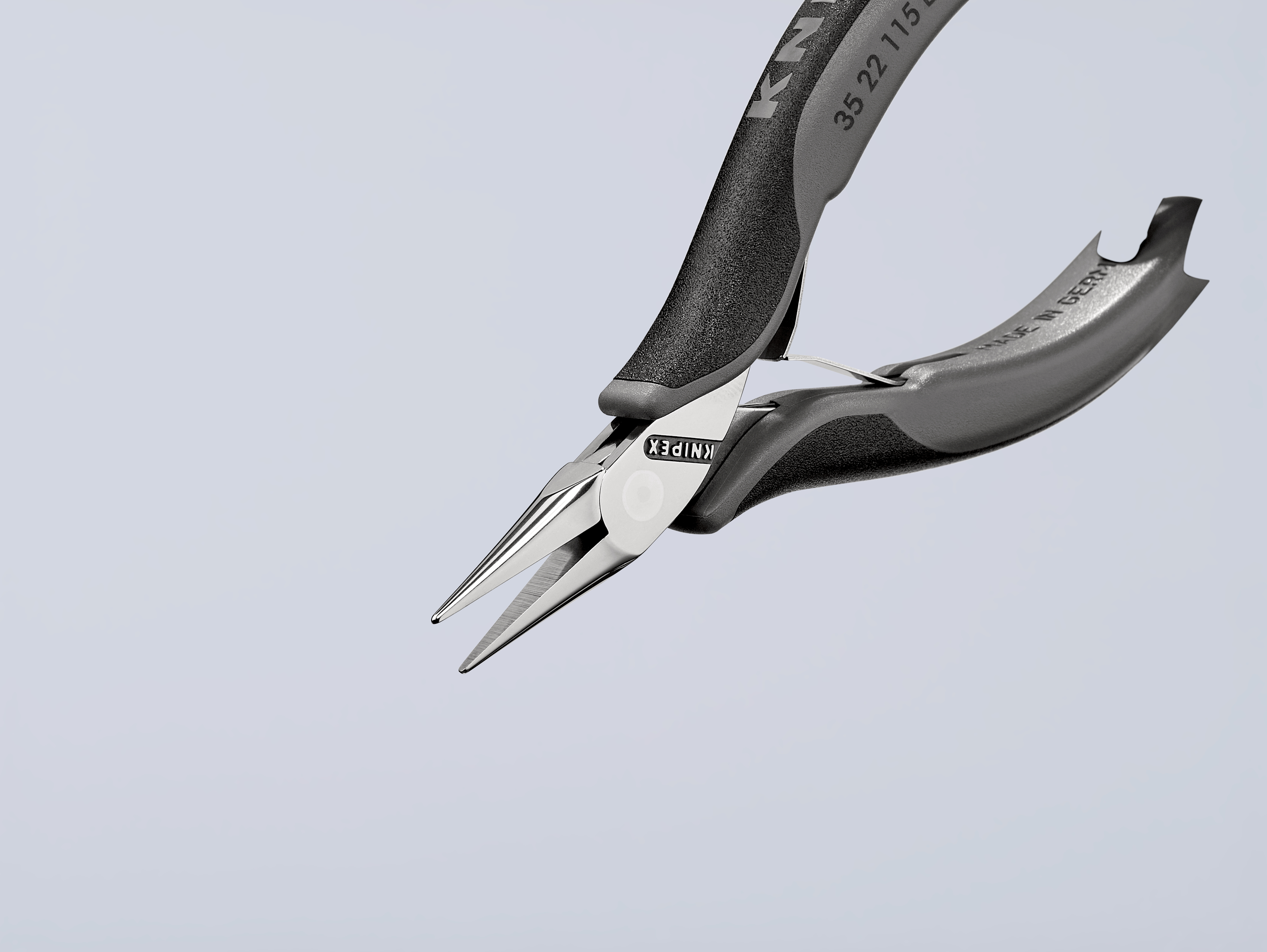 This is 115 mm Tool Steel Round Nose Pliers manufactured by Knipex. The manufacturer part number is 35 22 115 ESD. The product is made from highly stable and reliable ball bearing chrome steel.