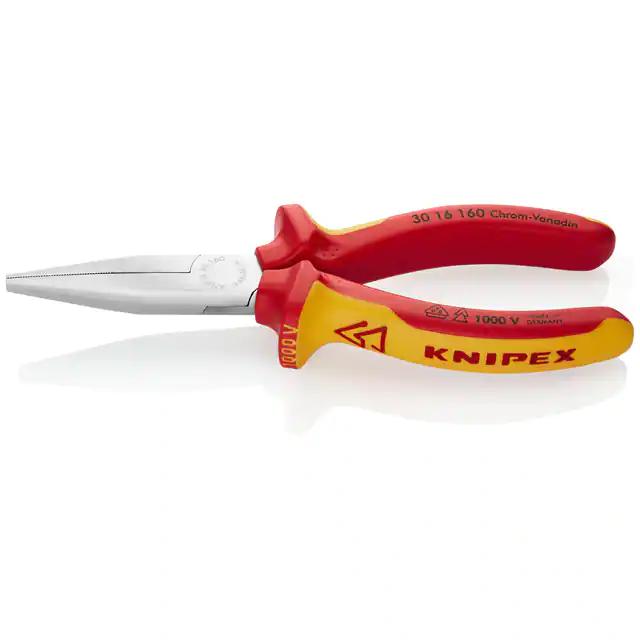 This is manufactured by Knipex Tools LP. The manufacturer part number is 30 16 160. This is basically a useful and handy standard. It is assigned with possible HTSUS value of 8203.20.6030. It is shipped in bulk. Its accurate length is 6.25" (158.8mm). Its typical moisture sensitivity level is 1 (unlimited). In addition, it is vendor undefined. The splendid features of the product include insulated to 1000v, soft grips. The built-in exquisite tip is a long nose tip. The product is designated with the ear99 code number