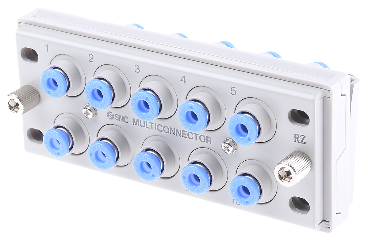 This is 10 Outlet Ports Brass PBT Pneumatic Multi-Connector Tube Panel Push In 4 mm manufactured by SMC. The manufacturer part number is KDM10-04. The product is available in bulkhead configuration. The product's body is nicely designed from pbt materials. Whereas, the minimum operating temperature of the product is -5°c. It has a maximum operating temperature of +60°c.