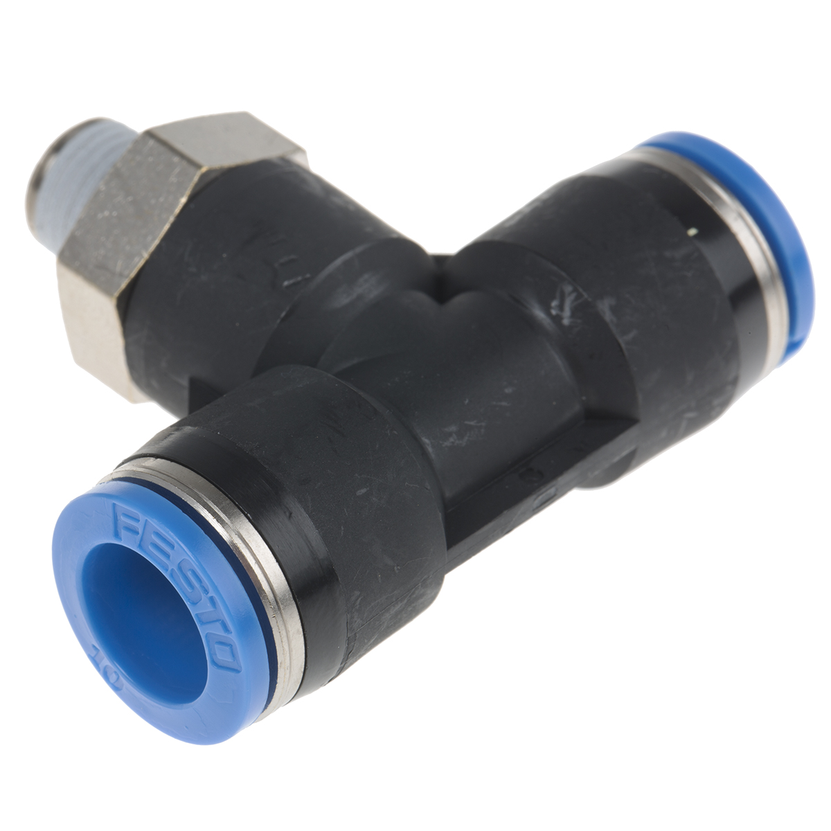 This is Pneumatic Tee Threaded-to-Tube Adapter R 1/8 Male x 10mm x 10mm 14 bar manufactured by Festo. The manufacturer part number is QST-1/8-10. A quality product with a nice nickel plated finish. Whereas, the minimum operating temperature of the product is -10°c. It has a maximum operating temperature of +80°c.