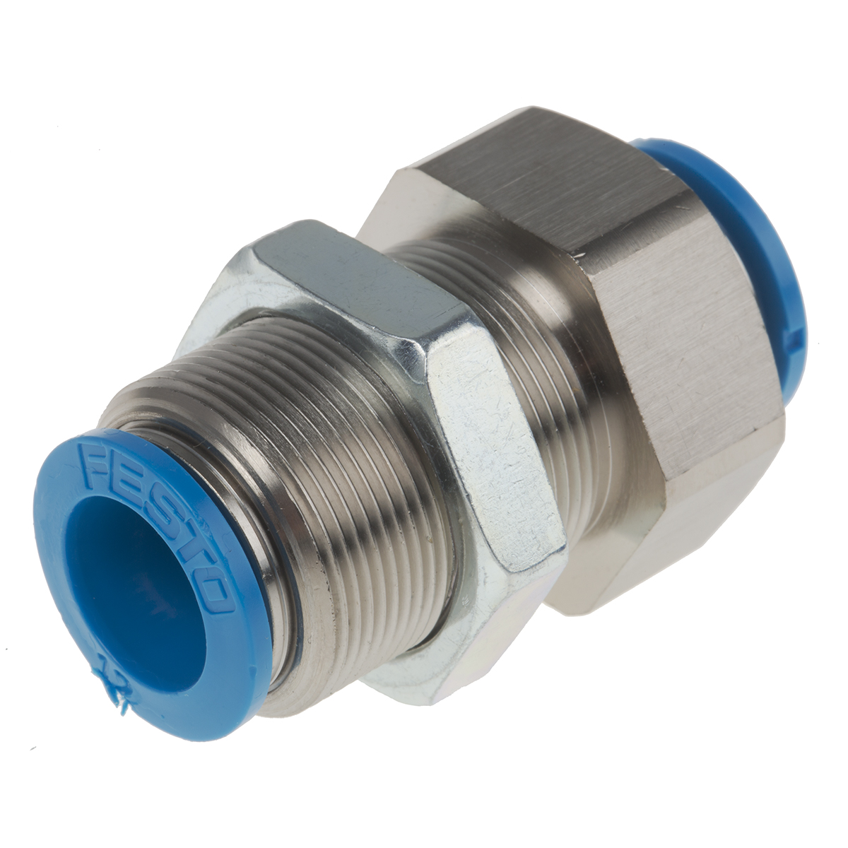 This is Pneumatic Bulkhead Tube-to-Tube Adapter Straight Connection A 12mm B 12mm manufactured by Festo. The manufacturer part number is QSS-12-F. A quality product with a nice nickel plated finish. The product's body is nicely designed from brass materials. Whereas, the minimum operating temperature of the product is -10°c. It has a maximum operating temperature of +80°c.