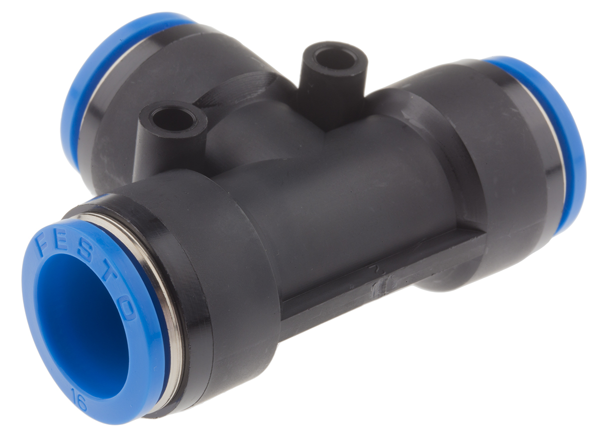 This is QST Pneumatic Tee Tube-to-Tube Adapter Push In 16 mm x Push In 16 mm manufactured by Festo. The manufacturer part number is QST-16. A quality product with a nice nickel plated finish. The product is available in inline configuration. The product's body is nicely designed from pbt materials. Whereas, the minimum operating temperature of the product is -10°c. It has a maximum operating temperature of +80°c.