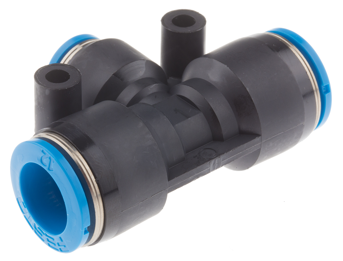 This is QST Pneumatic Tee Tube-to-Tube Adapter Push In 12 mm x Push In 12 mm x Push In 8 mm manufactured by Festo. The manufacturer part number is QST-12-8. The product is available in inline configuration. The product's body is nicely designed from pbt materials. Whereas, the minimum operating temperature of the product is -10°c. It has a maximum operating temperature of +80°c.