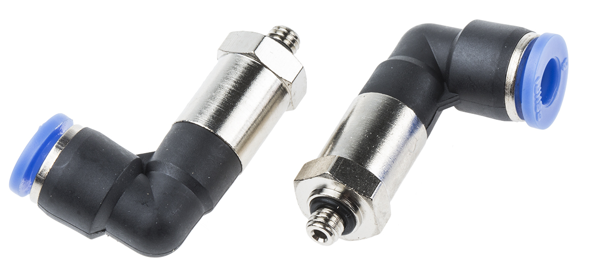 This is Pneumatic Elbow Threaded-to-Tube Adapter M5 x 0.8 6mm Tube Connection manufactured by RS Pro. The manufacturer part number is 916-0760. The product's body is nicely designed from polyoxymethylene materials. Whereas, the minimum operating temperature of the product is 0°c. It has a maximum operating temperature of +60°c.