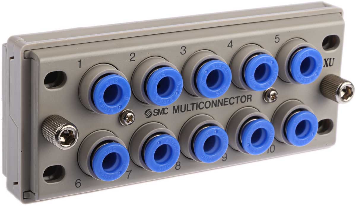 This is 10 Outlet Ports Brass PBT Pneumatic Multi-Connector Tube Panel Push In 6 mm manufactured by SMC. The manufacturer part number is KDM10-06. Whereas, the minimum operating temperature of the product is -5°c. It has a maximum operating temperature of +60°c.