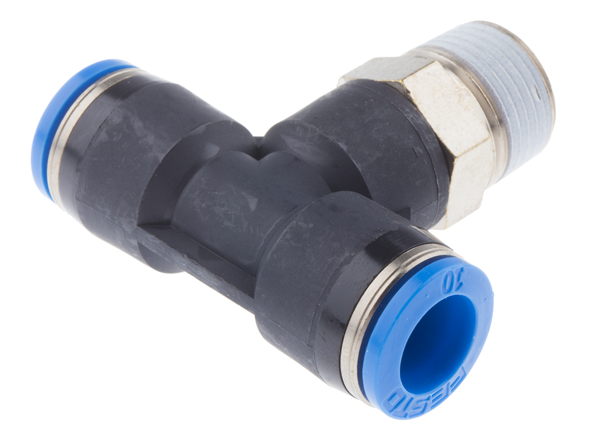 This is Pneumatic Tee Threaded-to-Tube Adapter R 3/8 Male x 10mm x 10mm 14 bar manufactured by Festo. The manufacturer part number is QST-3/8-10. A quality product with a nice nickel plated finish. Whereas, the minimum operating temperature of the product is -10°c. It has a maximum operating temperature of +80°c.