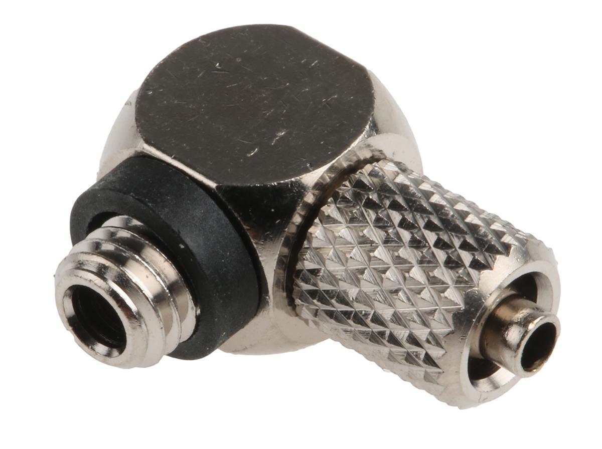 This is Hose Elbow M5 x 0.8 Male Hose 4 mm manufactured by SMC. The manufacturer part number is M-5HL-4. The product's body is nicely designed from nickel plated brass materials.