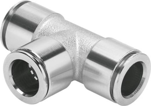 This is push-in T-connector manufactured by Festo. The manufacturer part number is NPQM-T-Q4-E-P10.
