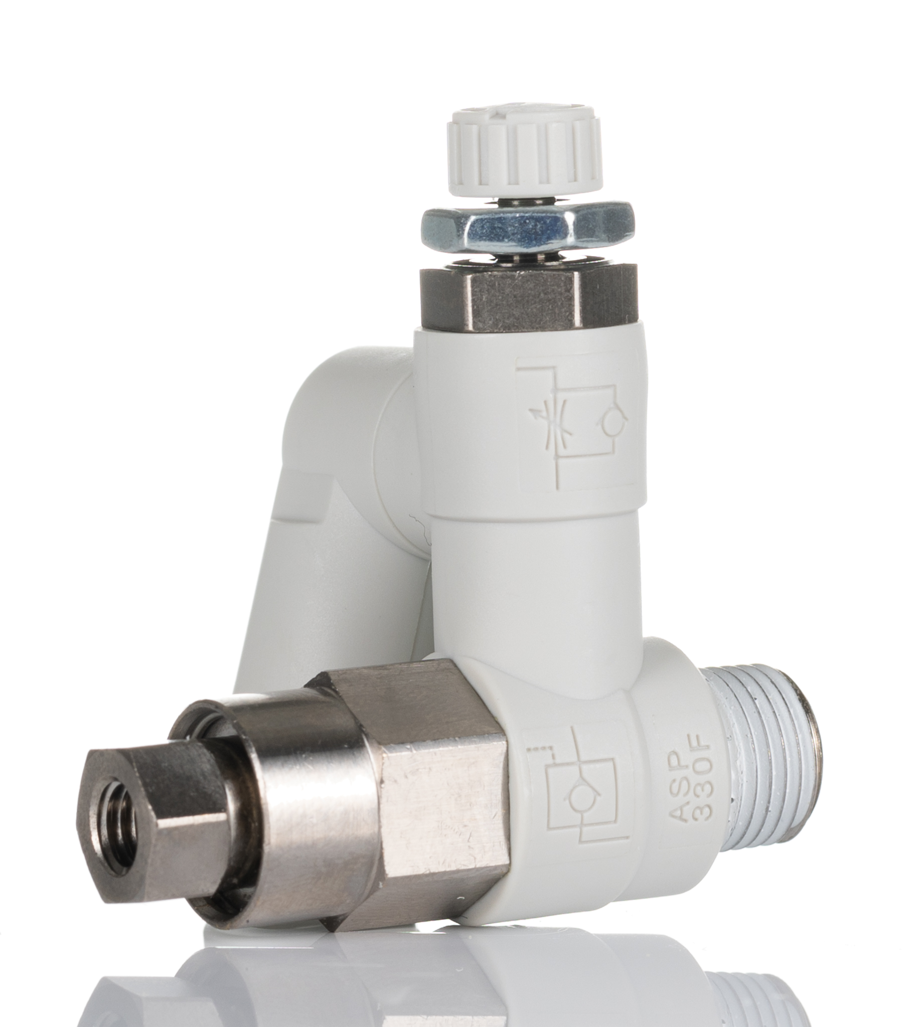 This is ASP Series Flow Regulator R 1/8 Male Inlet Port x 6mm Tube Outlet Port manufactured by SMC. The manufacturer part number is ASP330F-01-06S. It comes in flow controller configuration.