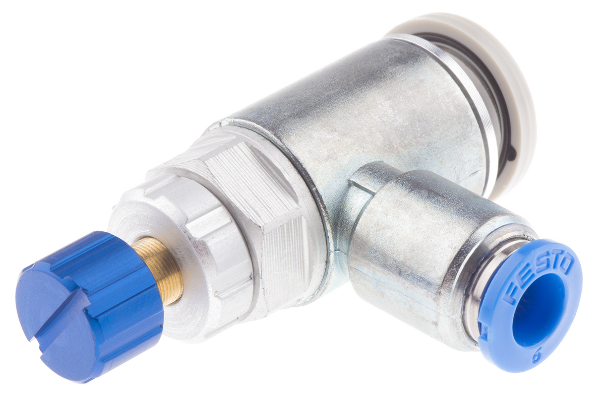 This is GRLA Series Exhaust Regulator 6mm Tube Inlet Port manufactured by Festo. The manufacturer part number is GRLA-1/4-QS-6-RS-D. The product's body is nicely designed from aluminium alloy materials. It comes in flow controller configuration.