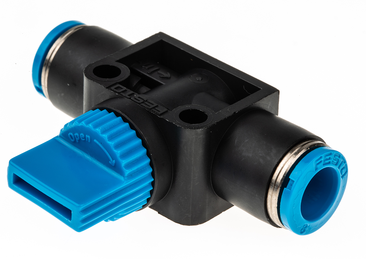 This is HE Series Pneumatic Manual Control Valve PBT manufactured by Festo. The manufacturer part number is HE-2-QS-8. The product's body is nicely designed from pbt materials. It comes in manual control valve configuration.
