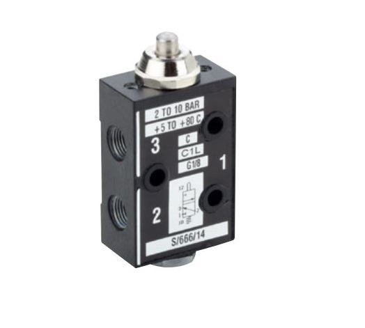 This is Plunger Pneumatic Manual Control Valve G 1/8 Die Cast Zinc Alloy 1/8 in G -20 → +80°C manufactured by Norgren. The manufacturer part number is S/666/14. It performs basic function of 3/2. It has a typical thread size of 1/8in. This product features 3/2 number of ports. The product's body is nicely designed from die cast zinc alloy materials. Whereas, the minimum operating temperature of the product is -20°c. It has a maximum operating temperature of +80°c.