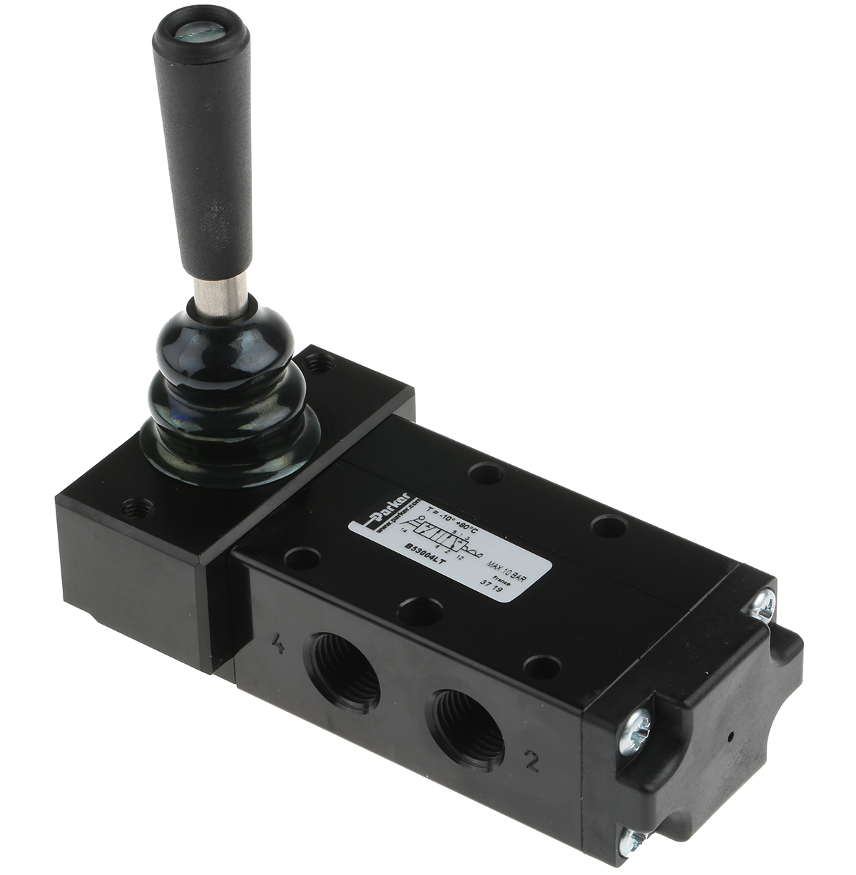 This is Lever Pneumatic Manual Control Valve G 1/4 Anodised Aluminium 1/4 in G -10 → +80°C manufactured by Parker. The manufacturer part number is B53004LT. It performs basic function of 5/2. It has a typical thread size of 1/4in. This product features 5/2 number of ports. The product's body is nicely designed from anodised aluminium materials. Whereas, the minimum operating temperature of the product is -10°c. It has a maximum operating temperature of +80°c.