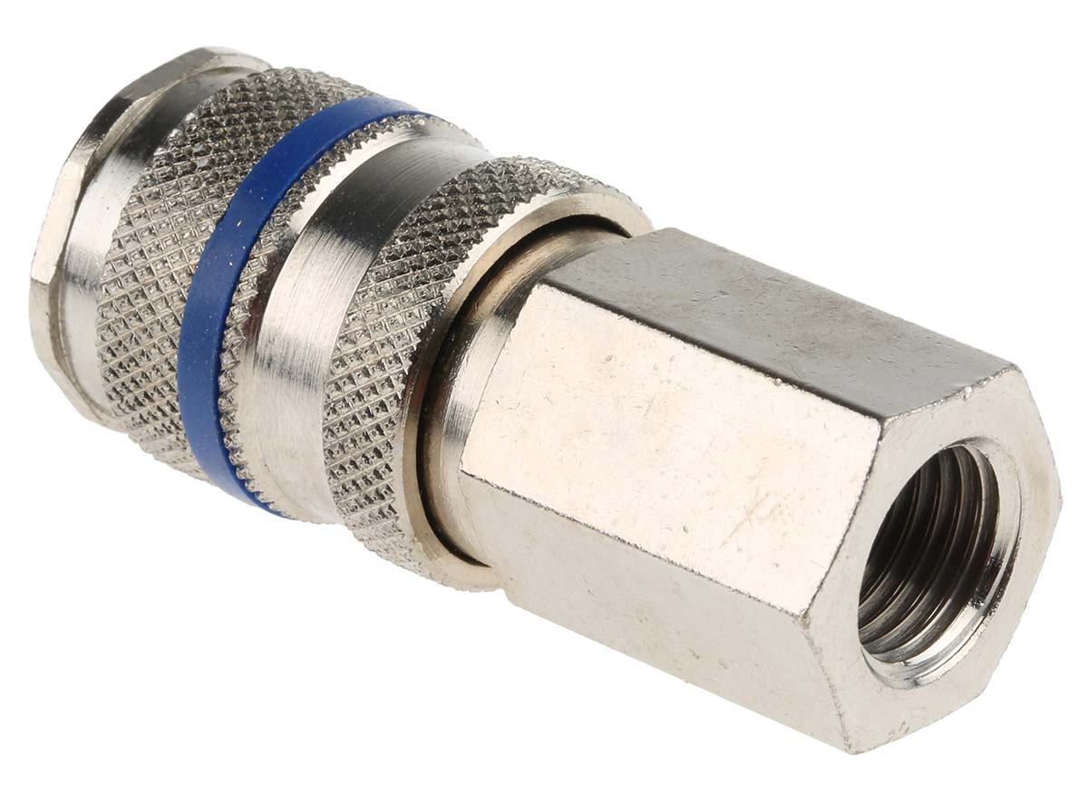 This is Steel Pneumatic Quick Connect Coupling G 1/4 Female Threaded manufactured by RS Pro. The manufacturer part number is 667-1917. A quality product with a nice nickel plated finish. The product is made from highly stable and reliable steel. It has a typical thread size of 1/4in. Whereas, the minimum operating temperature of the product is -20°c. It has a maximum operating temperature of +100°c.