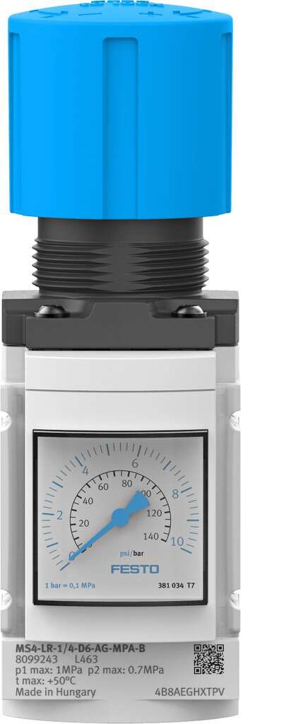 This is G 1/4 Pneumatic Regulator - 0.1MPa to 1MPa 1/4 in 10bar max. input 8099359 manufactured by Festo. The manufacturer part number is MS4-LR-1/4-D6-AG-MPA-B. Whereas, the minimum operating temperature of the product is -5°c. It has a maximum operating temperature of +50°c.