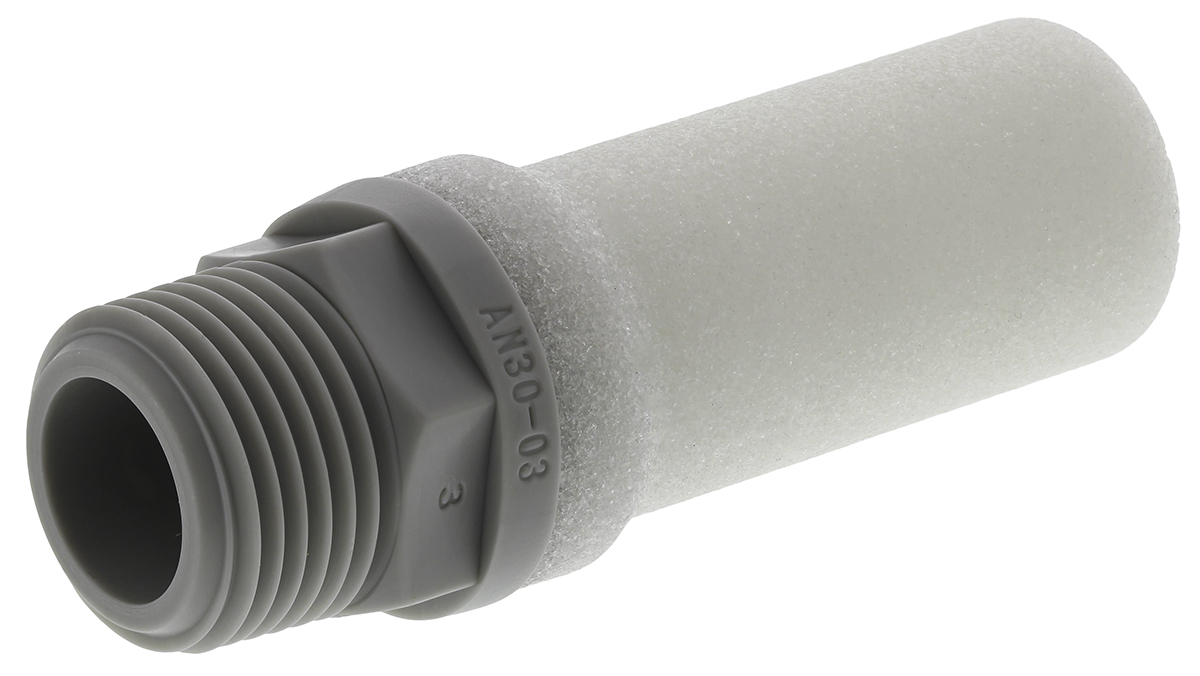 This is AN Resin 1Mpa Pneumatic Silencer Threaded R 3/8 Male manufactured by SMC. The manufacturer part number is AN30-03. It has a maximum operating temperature of +60°c. The product is made from highly stable and reliable resin. Whereas, the minimum operating temperature of the product is +5°c. It comes in silencer configuration.