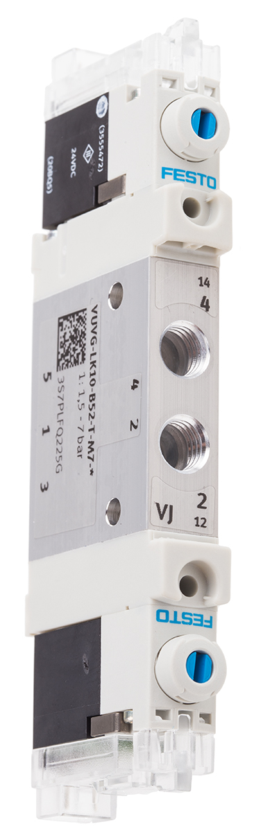 This is VUVG M7 5/2 Solenoid/Solenoid Inline Pneumatic Solenoid Valve manufactured by Festo. The manufacturer part number is VUVG-LK10-B52-T-M7-1H2L-S. It performs basic function of 5/2. Whereas, the minimum operating temperature of the product is -5°c. It has a typical thread size of m7. This product features 5 number of ports. The product's body is nicely designed from aluminium alloy materials. It has a maximum operating temperature of +50°c. The product carries possible position value of 2.