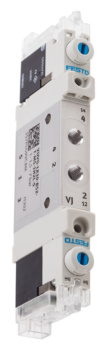 This is VUVG Metric M5 5/2 Solenoid/Solenoid Inline Pneumatic Solenoid Valve manufactured by Festo. The manufacturer part number is VUVG-LK10-B52-T-M5-1H2L-S. It performs basic function of 5/2. Whereas, the minimum operating temperature of the product is -5°c. It has a typical thread size of m5. This product features 5 number of ports. The product's body is nicely designed from aluminium alloy materials. It has a maximum operating temperature of +50°c. The product carries possible position value of 2.