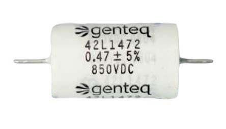 This is 470nF Polypropylene Capacitor PP 450 V ac 850 V dc ±5% Tolerance 42L Series manufactured by Genteq. The manufacturer part number is 42L1472. The given dimensions of the product include 17 (dia.) x 31mm. The product 42l, is a highly preferred choice for users. It provides a 470nf of capacitance value. Its accurate length is 31mm. It carries a 450 v ac, 850 v dc of voltage. Whereas, the minimum operating temperature of the product is -40°c. It has a maximum operating temperature of +85°c. It features ±5% of tolerance value. The terminal is a axial type.