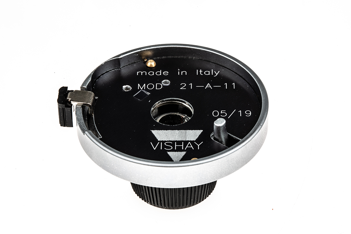 This is Potentiometer Knob Body: Silver for use with knob Dia. 46.02mm with a Black Indicator 6.35mm Shaft manufactured by Vishay. The manufacturer part number is 21A11B10.