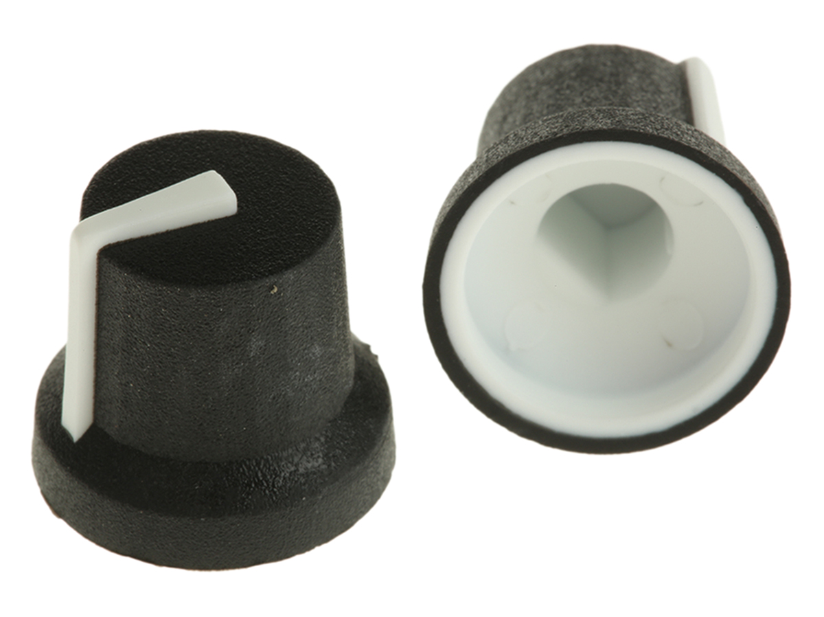 This is Potentiometer Knob Body: Black for use with knob Dia. 16.8mm with a White Indicator 6mm Shaft manufactured by RS Pro. The manufacturer part number is 777-7366.