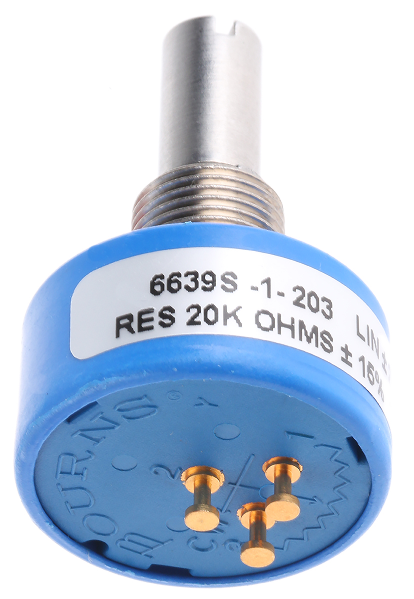 This is 6639 Series Conductive Plastic Potentiometer with a 6.35 mm Dia. Shaft Continuous-Turn 20kΩ ±15% 1W manufactured by Bourns. The manufacturer part number is 6639S-1-203. The product is available in panel mount configuration. The product 6639, is a highly preferred choice for users. Moreover, it has solder turret terminal style. It comprises 1 gangs. Consist of continuous turns. The product carries slotted shaft actuator. It features ±15% of tolerance value.