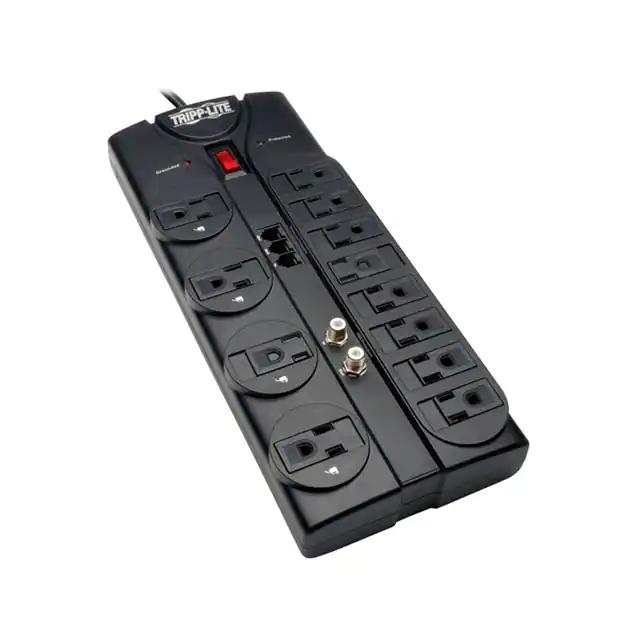This is manufactured by Tripp Lite. The manufacturer part number is TLP1208TELTV. It is assigned with possible HTSUS value of 8537.10.9170. The product is rohs compliant. The product also features robust plastic housing material. It is approved by csa, cul, fcc, ul. The possible product's input voltage is 120v. It comes in outlet strip, surge protector configuration. The given maximum current is 15a. It is shipped in bulk. The product is utilised in various regions, including north america. Its typical moisture sensitivity level is not applicable. The cord is 8' (2.44m) long. It has a long 2 weeks standard lead time. The product is available in bench, floor, wall configuration. The product protect it!®, is a highly preferred choice for users. It carries an energy of 2880j. The product is designated with the ear99 code number