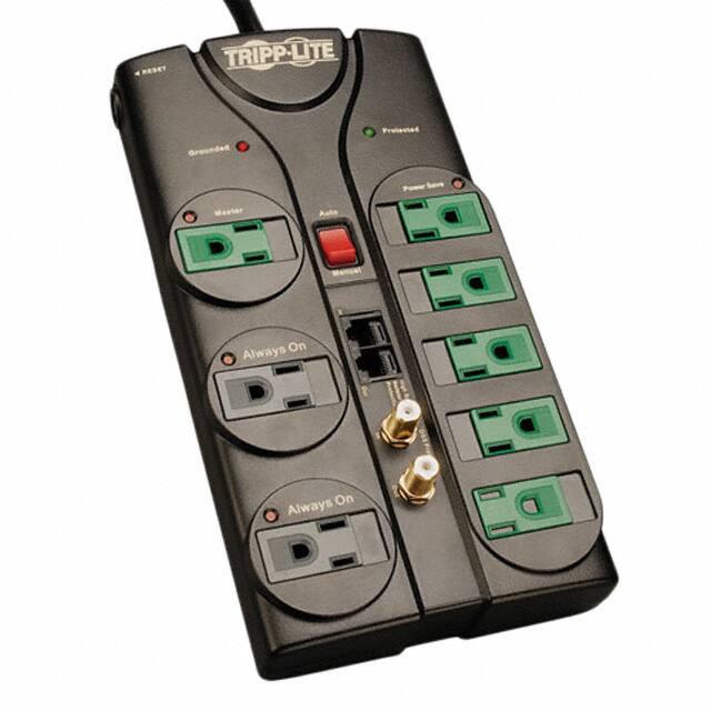 This is manufactured by Tripp Lite. The manufacturer part number is AV88SATG. It is assigned with possible HTSUS value of 8537.10.9170. The product also features robust plastic housing material. It is approved by csa, cul, ul. The possible product's input voltage is 120v. It comes in outlet strip, surge protector configuration. The given maximum current is 15a. In addition, it is reach unaffected. It is shipped in bulk. The product is utilised in various regions, including north america. Its typical moisture sensitivity level is not applicable. The cord is 8' (2.44m) long. The product is available in bench, floor, wall configuration. The product eco-surge™, is a highly preferred choice for users. It carries an energy of 2880j. The product is designated with the ear99 code number