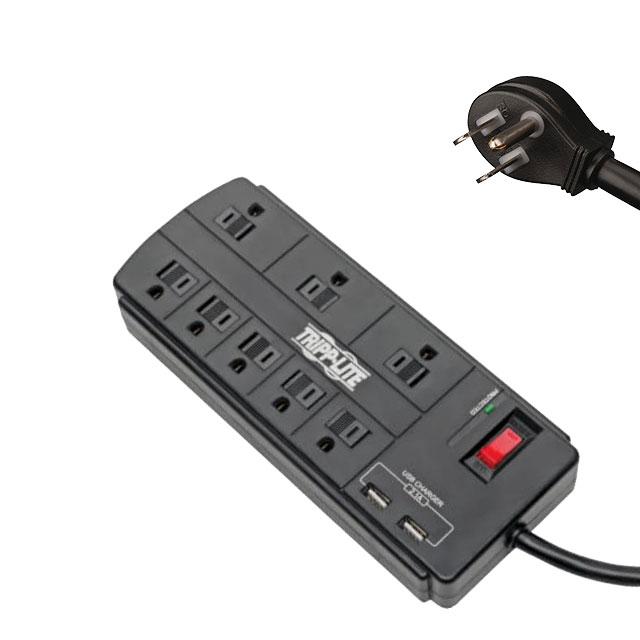 This is manufactured by Tripp Lite. The manufacturer part number is TLP88TUSBB. It is assigned with possible HTSUS value of 8537.10.9170. The product is rohs compliant. The product also features robust plastic housing material. It is approved by csa, cul, ul. The possible product's input voltage is 120v. It comes in outlet strip, surge protector configuration. The given maximum current is 15a. It is shipped in bulk. The product is utilised in various regions, including north america. Its typical moisture sensitivity level is not applicable. The cord is 8' (2.44m) long. It has a long 2 weeks standard lead time. The splendid features of the product include switch, usb charge port(s). The product is available in bench, floor, wall configuration. It carries an energy of 1200j. The product is designated with the ear99 code number