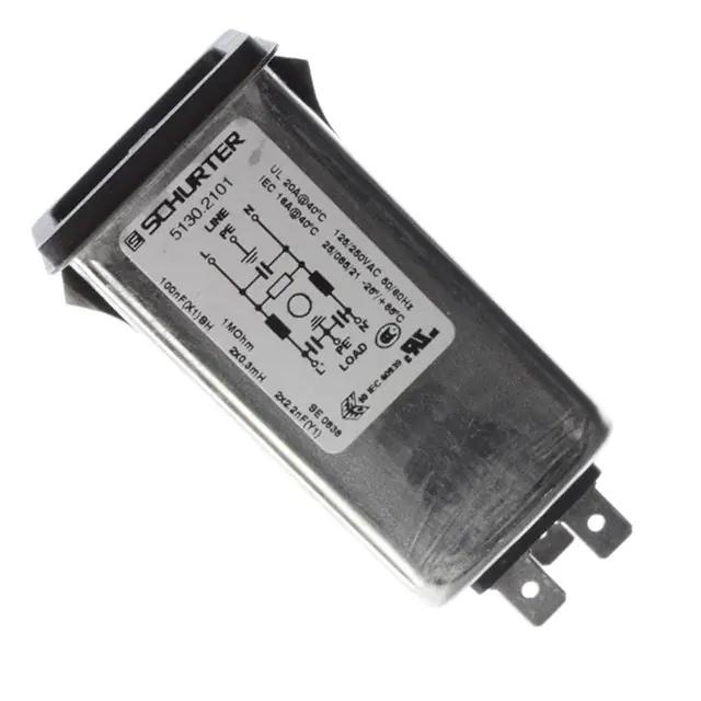 This is manufactured by Schurter Inc.. The manufacturer part number is 5130.2101. Filter with 16/20a current rating. It is assigned with possible HTSUS value of 8536.30.8000. The product is rohs3 compliant. It has a panel thickness of 0.031" ~ 0.118" (0.79mm ~ 3.00mm). It is approved by culus, enec. It also has a rectangular - 35.00mm x 27.00mm dimensional features. The filter is a filtered (emi, rfi) - commercial type with excellent features. It comes in iec 320-c20 connector style. The product carries possible position value of 3. The appliance's inlet current rating is 16a. The appliance has a voltage rating of 250vac its inlet. In addition, it is reach unaffected. It carries ul94 v-0 of material flammability rating. It is shipped in bulk. receptacle, male blades Connector type offer robust functionality. Fuse Accommodation - [Accommodates a Fuse]. Its typical moisture sensitivity level is not applicable. The product features quick connect - 0.250" (6.3mm) termination style. It has a long 31 weeks standard lead time. It is IP rated with ip40. The splendid features of the product include shielded. The product is available in panel mount, snap-in configuration. The product 5130, is a highly preferred choice for users. The product is designated with the ear99 code number