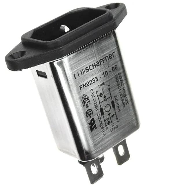 This is manufactured by Schaffner EMC Inc.. The manufacturer part number is FN9233-10-06. Filter with 10a current rating. It is assigned with possible HTSUS value of 8536.69.4030. The product is rohs3 compliant. It is approved by cqc, csa, enec, ul. It also has a rectangular - 28.50mm x 21.50mm dimensional features. The filter is a filtered (emi, rfi) - commercial type with excellent features. It comes in iec 320-c14 connector style. The product carries possible position value of 3. In addition, it is reach unaffected. It carries ul94 v-2 of material flammability rating. It is shipped in tray. receptacle, male blades Connector type offer robust functionality. Fuse Accommodation - [Accommodates a Fuse]. Its typical moisture sensitivity level is not applicable. The product features quick connect - 0.250" (6.3mm) termination style. It has a long 16 weeks standard lead time. It is IP rated with ip40. The splendid features of the product include front or rear side mount. The product is available in panel mount, flange configuration. The product fn 9233, is a highly preferred choice for users. Moreover, it corresponds to fn9233, a base product number of the product. The product is designated with the ear99 code number