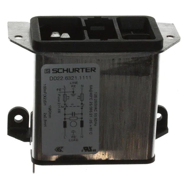 This is manufactured by Schurter Inc.. The manufacturer part number is DD22.6321.1111. Filter with 6a current rating. It is assigned with possible HTSUS value of 8536.30.8000. The product is rohs3 compliant. It has a panel thickness of 0.138" (3.50mm). It is approved by culus, enec. The filter is a filtered (emi, rfi) - commercial, medical type with excellent features. It comes in iec 320-c14 connector style. The product carries possible position value of 3. Switch Attributes - switch on-off. The appliance's inlet current rating is 10a. The appliance has a voltage rating of 250vac its inlet. In addition, it is reach unaffected. It carries ul94 v-0 of material flammability rating. It is shipped in bulk. receptacle, male blades - module Connector type offer robust functionality. Fuse Accommodation - [Accommodates a Fuse]. Its typical moisture sensitivity level is not applicable. The product features solder, quick connect - 0.250" (6.3mm) termination style. It has a long 30 weeks standard lead time. It is IP rated with ip40. The product is available in panel mount, flange; through hole, right angle configuration. The product dd22, is a highly preferred choice for users. Supplied with a drawer sold separate. Moreover, it corresponds to dd22.6321, a base product number of the product. The product is designated with the ear99 code number
