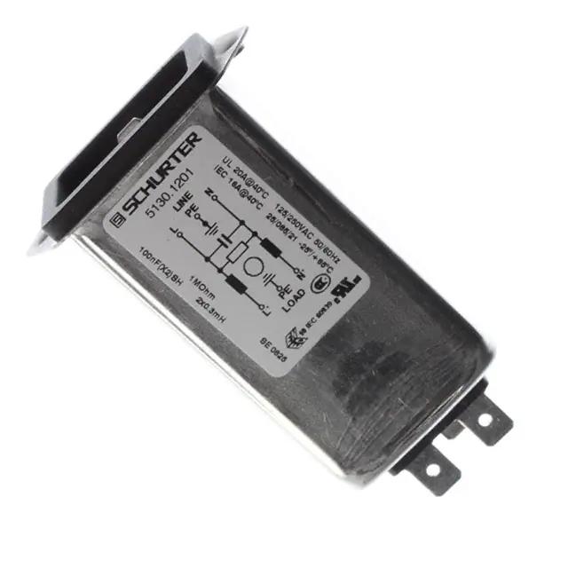 This is manufactured by Schurter Inc.. The manufacturer part number is 5130.1201. It is assigned with possible HTSUS value of 8536.30.8000. The product is rohs3 compliant. It is approved by culus, enec. It also has a rectangular - 36.50mm x 28.50mm dimensional features. The filter is a filtered (emi, rfi) - commercial, medical type with excellent features. It comes in iec 320-c20 connector style. The product carries possible position value of 3. The appliance's inlet current rating is 16a. The appliance has a voltage rating of 250vac its inlet. In addition, it is reach unaffected. It carries ul94 v-0 of material flammability rating. It is shipped in bulk. receptacle, male blades Connector type offer robust functionality. Fuse Accommodation - [Accommodates a Fuse]. Its typical moisture sensitivity level is not applicable. The product features quick connect - 0.250" (6.3mm) termination style. It has a long 28 weeks standard lead time. It is IP rated with ip40. The splendid features of the product include shielded. The product is available in panel mount, flange configuration. The product 5130, is a highly preferred choice for users. The product is designated with the ear99 code number