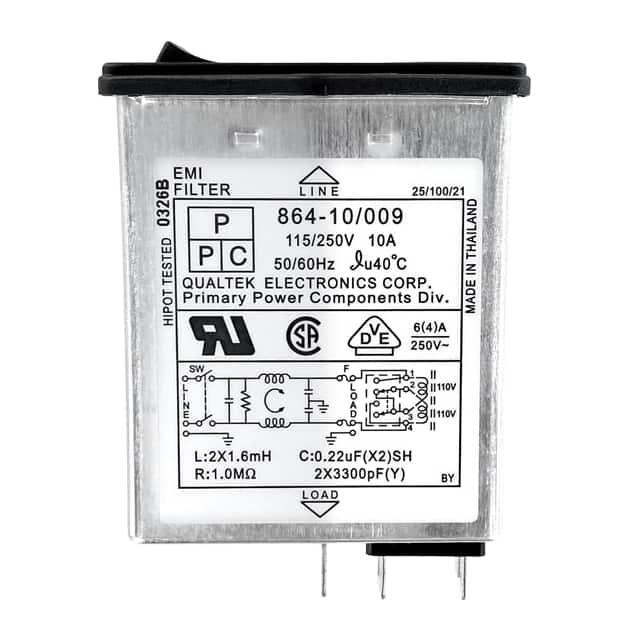 This is manufactured by Qualtek. The manufacturer part number is 864-10/009. It is assigned with possible HTSUS value of 8536.69.4030. The product is rohs3 compliant. It is approved by csa, ul, vde. It also has a rectangular - 28.96mm x 60.20mm dimensional features. The filter is a filtered (emi, rfi) - commercial type with excellent features. It comes in iec 320-c14 connector style. The product carries possible position value of 3. Switch Attributes - switch on-off. The appliance's inlet current rating is 4/6a. The appliance has a voltage rating of 250vac its inlet. In addition, it is reach unaffected. It is shipped in tray. receptacle, male blades - module Connector type offer robust functionality. Fuse Accommodation - [Accommodates a Fuse]. Its typical moisture sensitivity level is not applicable. The product features quick connect termination style. It has a long 41 weeks standard lead time. The splendid features of the product include voltage selector. The product is available in panel mount, flange configuration. The product 864, is a highly preferred choice for users. Supplied with a fuse holder, twin fused. Moreover, it corresponds to 864-10, a base product number of the product. The product is designated with the ear99 code number