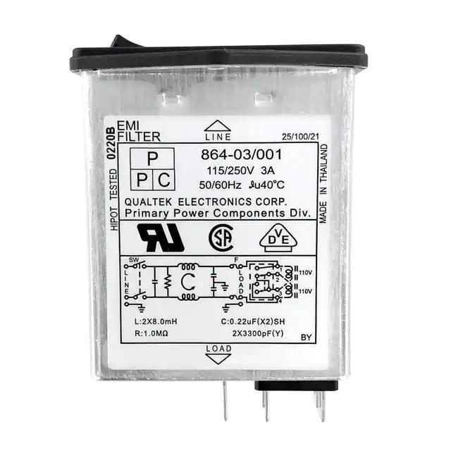 This is manufactured by Qualtek. The manufacturer part number is 864-03/001. It is assigned with possible HTSUS value of 8536.69.4030. The product is rohs3 compliant. It is approved by csa, ul, vde. It also has a rectangular - 28.96mm x 60.20mm dimensional features. The filter is a filtered (emi, rfi) - commercial type with excellent features. It comes in iec 320-c14 connector style. The product carries possible position value of 3. Switch Attributes - switch on-off. The appliance's inlet current rating is 3a. The appliance has a voltage rating of 115/250vac its inlet. In addition, it is reach unaffected. It is shipped in tray. receptacle, male blades - module Connector type offer robust functionality. Fuse Accommodation - [Accommodates a Fuse]. Its typical moisture sensitivity level is not applicable. The product features quick connect termination style. It has a long 41 weeks standard lead time. The splendid features of the product include voltage selector. The product is available in panel mount, flange configuration. The product 864, is a highly preferred choice for users. Supplied with a fuse holder, twin fused. Moreover, it corresponds to 864-03, a base product number of the product. The product is designated with the ear99 code number