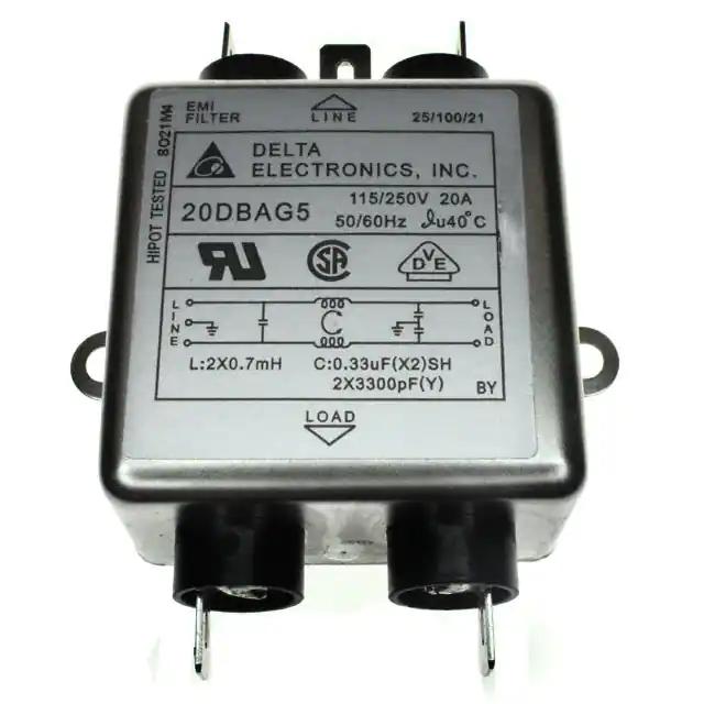 This is manufactured by Delta Electronics. The manufacturer part number is 20DBAG5. The product has 115v, 250v AC voltage rating. It is assigned with possible HTSUS value of 8548.00.0000. The product is rohs3 compliant. Moreover, it has quick connect terminal style. Features a 20 a current in A. The product has -25°c ~ 100°c operating temperature range. It is approved by csa, ur, vde. In addition, it is reach unaffected. The product is widely employed in general purpose. The product has a 700µh inductance value. The product is available in single stage configuration. It is shipped in box. Its typical moisture sensitivity level is 1 (unlimited). The filter is a single phase type with excellent features. It has a long 52 weeks standard lead time. The product is available in chassis mount configuration. The product db, is a highly preferred choice for users. Features an operating frequency of 50/60hz. The product is designated with the ear99 code number