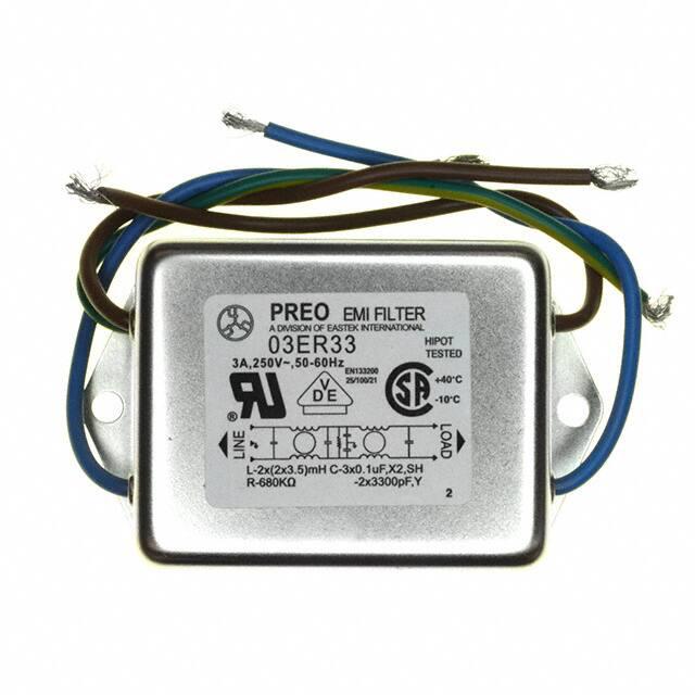 This is manufactured by Curtis Industries. The manufacturer part number is 03ER33. The product has 250v AC voltage rating. It is assigned with possible HTSUS value of 8536.30.8000. The product is rohs non-compliant. Moreover, it has wire leads terminal style. Features a 3 a current in A. It is approved by csa, ur, vde. In addition, it is reach unaffected. The product is widely employed in general purpose. The product is available in two stage configuration. Its typical moisture sensitivity level is not applicable. The filter is a single phase type with excellent features. The product is available in chassis mount configuration. The product er, curtis industries/preo, is a highly preferred choice for users. Features an operating frequency of 50/60hz. The product is designated with the ear99 code number