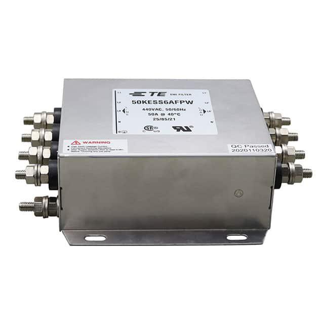 This is manufactured by TE Connectivity Corcom Filters. The manufacturer part number is 50KESS6AFPW. The product has 440v AC voltage rating. It is assigned with possible HTSUS value of 8548.00.0000. The product is rohs3 compliant. Moreover, it has threaded post (m6) terminal style. Features a 52 a current in A. The product has -25°c ~ 85°c operating temperature range. It is approved by csa, ul. In addition, it is reach unaffected. The product is widely employed in general purpose. The product is available in single stage configuration. It is shipped in box. Its typical moisture sensitivity level is not applicable. The filter is a three phase (wye) type with excellent features. It has a long 10 weeks standard lead time. The product is available in chassis mount configuration. The product kes, is a highly preferred choice for users. Features an operating frequency of 50/60hz. Moreover, it corresponds to 50kess6a, a base product number of the product. The product is designated with the ear99 code number