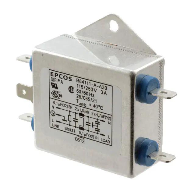 This is manufactured by EPCOS - TDK Electronics. The manufacturer part number is B84111A0000A030. The product has 250v AC voltage rating. It is assigned with possible HTSUS value of 8548.00.0000. The product is rohs3 compliant. Moreover, it has quick connect terminal style. Features a 3 a current in A. It is approved by csa, enec, ur. In addition, it is reach affected. The product is widely employed in general purpose. The product has a 1.5mh inductance value. The product is available in single stage configuration. It is shipped in tray. Retains 250v DC rated voltage. Its typical moisture sensitivity level is 1 (unlimited). The filter is a single phase type with excellent features. It has a long 36 weeks standard lead time. The product is available in chassis mount configuration. The product b84111a, is a highly preferred choice for users. Features an operating frequency of 50/60hz. The product is designated with the ear99 code number