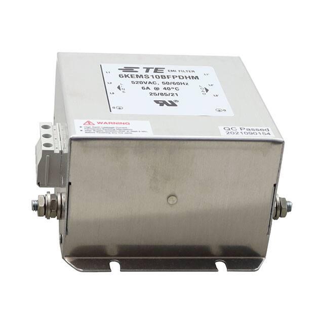 This is manufactured by TE Connectivity Corcom Filters. The manufacturer part number is 6KEMS10BFPDHM. The product has 520v AC voltage rating. It is assigned with possible HTSUS value of 8548.00.0000. The product is rohs3 compliant. Moreover, it has terminal block terminal style. Features a 6 a current in A. The product has -25°c ~ 85°c operating temperature range. It is approved by csa, ul. The product is widely employed in converter. The product is available in single stage configuration. It is shipped in box. Its typical moisture sensitivity level is not applicable. The filter is a three phase (delta) type with excellent features. It has a long 10 weeks standard lead time. The product is available in chassis mount configuration. The product kem, is a highly preferred choice for users. Features an operating frequency of 50 ~ 60hz. The product is designated with the ear99 code number