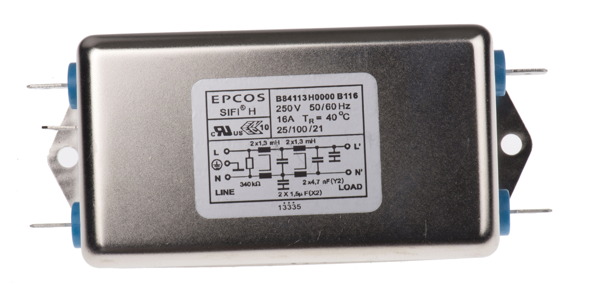 This is B84113H Series 16A 250 V ac/dc 50 → 60Hz Chassis Mount RFI Filter with Tab Terminals Single Phase manufactured by EPCOS. The manufacturer part number is B84113H0000B116. The given dimensions of the product include 52 x 117.5 x 43mm. The product is available in chassis mount configuration. The product b84113h, is a highly preferred choice for users. Moreover, it has tab terminal style. Whereas, the minimum operating temperature of the product is -25°c. Its accurate length is 52mm. In addition, the height is 43mm. It provides a 1.5 x 2 μf, 4700 x 2pf of capacitance value. The product comes in 117.5mm depth. The product has a 1.3 x 4 mh inductance value. It has a maximum operating temperature of +100°c.