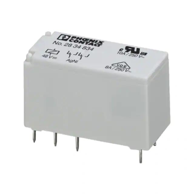 This is manufactured by Phoenix Contact. The manufacturer part number is 2834834. It is assigned with possible HTSUS value of 8536.41.0020. The product is rohs compliant. The coil voltage of the product is 48vdc. Moreover, it has pc pin terminal style. The product has -40°c ~ 85°c operating temperature range. It holds up to 5.52 kohms coil resistance. It has a coil current of 8.7 ma. The coil is a non latching type. The product's switching voltage is 250vac, 250vdc - max. This is basically a general purpose. It is shipped in bulk. It also has a dpdt (2 form c) contact form. Its typical moisture sensitivity level is 1 (unlimited). The operating time of the product is 7 ms. It has a long 4 weeks standard lead time. It has a contact current rating of 8 a. The product is available in through hole configuration. While 3 ms is its release time. The product is made from sturdy silver nickel (agni) materials. The product is designated with the ear99 code number