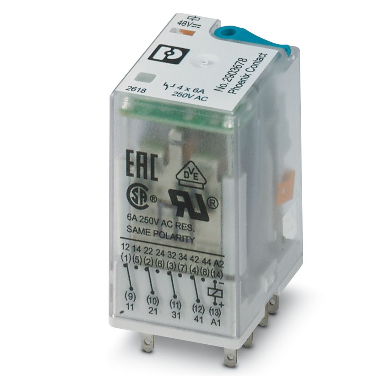 This is manufactured by Phoenix Contact. The manufacturer part number is 2903678. The product is available in plug in configuration. The product rel-ir4/ldp- 48dc/4x21, is a highly preferred choice for users. The coil voltage of the product is 48v dc. Its accurate length is 21.2mm. In addition, the height is 35.6mm. The product comes in 27.5mm depth. It has equipped with 4 poles. The terminal is a plug in type. It is assigned with possible HTSUS value of 8536.49.0050. The product is rohs compliant. The coil voltage of the product is 48vdc. Moreover, it has plug in terminal style. The product has -40°c ~ 70°c operating temperature range. It holds up to 2.2 kohms coil resistance. It has a coil current of 22 ma. The coil is a non latching type. The product's switching voltage is 250vac, 250vdc - max. This is basically a general purpose. It is shipped in bulk. It also has a 4pdt (4 form c) contact form. Its typical moisture sensitivity level is 1 (unlimited). The operating time of the product is 13 ms. It has a long 44 weeks standard lead time. It has a contact current rating of 6 a. The splendid features of the product include diode, lighted indicator, test button. The product is available in socketable configuration. The product rel-ir, is a highly preferred choice for users. While 14 ms is its release time. The product is made from sturdy silver nickel (agni) materials. The product is designated with the ear99 code number