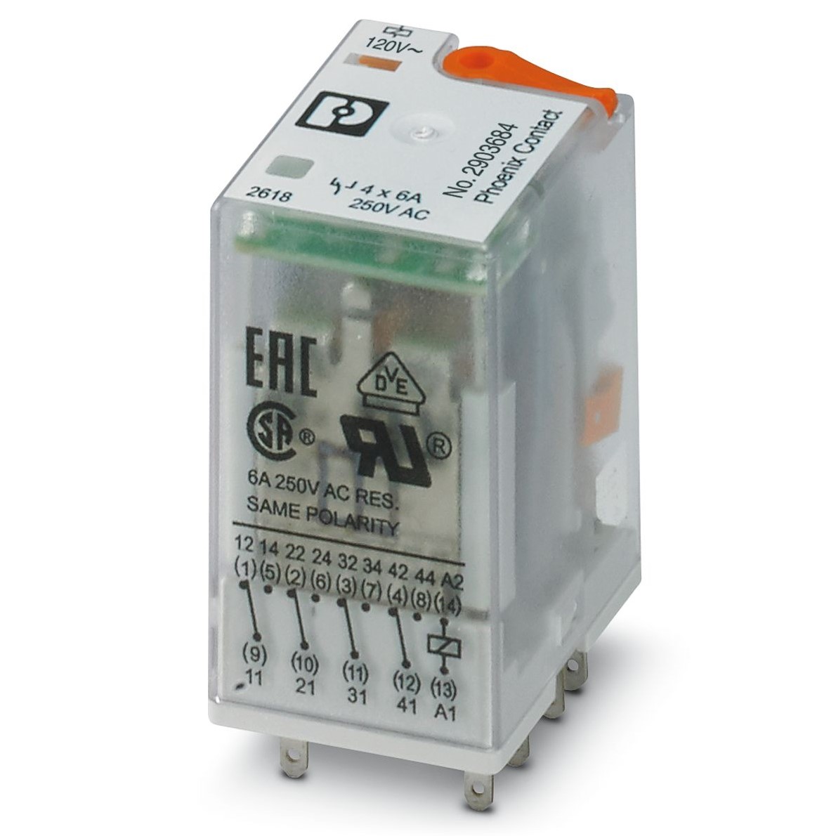 This is manufactured by Phoenix Contact. The manufacturer part number is 2903684. The product is available in plug in configuration. The product rel-ir4/l-120ac/4x21au, is a highly preferred choice for users. The coil voltage of the product is 120v ac. Its accurate length is 21.2mm. In addition, the height is 35.6mm. The product comes in 27.5mm depth. It has equipped with 4 poles. The terminal is a plug in type. It is assigned with possible HTSUS value of 8536.49.0050. The product is rohs compliant. The coil voltage of the product is 120vac. Moreover, it has plug in terminal style. The product has -40°c ~ 55°c operating temperature range. It holds up to 9.2 kohms coil resistance. It has a coil current of 13 ma. The coil is a non latching type. The product's switching voltage is 250vac, 250vdc - max. This is basically a general purpose. It is shipped in bulk. It also has a 4pdt (4 form c) contact form. Its typical moisture sensitivity level is 1 (unlimited). The operating time of the product is 15 ms. It has a long 44 weeks standard lead time. It has a contact current rating of 6 a. The splendid features of the product include lighted indicator, mechanical indicator, test button. The product is available in socketable configuration. The product rel-ir, is a highly preferred choice for users. While 20 ms is its release time. The product is made from sturdy silver nickel (agni), gold (au) materials. The product is designated with the ear99 code number