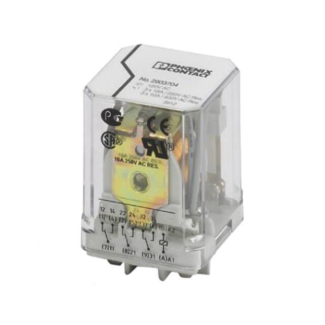 This is manufactured by Phoenix Contact. The manufacturer part number is 2903704. The product is available in din rail configuration. Robust coil power of 2.76w. The product rel-pr3-120ac/3x21, is a highly preferred choice for users. The coil voltage of the product is 120v ac. It is assigned with possible HTSUS value of 8536.41.0050. The product is rohs compliant. The coil voltage of the product is 120vac. Moreover, it has plug in terminal style. The product has -40°c ~ 55°c operating temperature range. It holds up to 5.22 kohms coil resistance. It has a coil current of 23 ma. The coil is a non latching type. The product's switching voltage is 440vac, 250vdc - max. This is basically a general purpose. It also has a 3pdt (3 form c) contact form. Its typical moisture sensitivity level is 1 (unlimited). The operating time of the product is 25 ms. It has a long 21 weeks standard lead time. It has a contact current rating of 16 a. The product is available in socketable configuration. The product rel-pr3, is a highly preferred choice for users. While 20 ms is its release time. The product is made from sturdy silver nickel (agni) materials. The product is designated with the ear99 code number