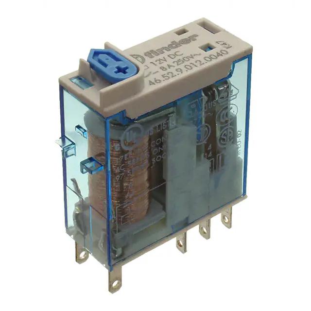 This is manufactured by Finder Relays, Inc.. The manufacturer part number is 46.52.9.012.0040. It is assigned with possible HTSUS value of 8536.41.0020. The product is rohs3 compliant. The coil voltage of the product is 12vdc. Moreover, it has plug in, quick connect - 0.110" (2.8mm) terminal style. In addition, it is reach unaffected. The product has -40°c ~ 70°c operating temperature range. It has a coil current of 40 ma. The coil is a non latching type. The product's switching voltage is 440vac - max. On the other hand, 8.8 vdc is the given crucial/must operating voltage. This is basically a general purpose. It is shipped in bulk. It also has a dpdt (2 form c) contact form. Its typical moisture sensitivity level is not applicable. The operating time of the product is 10 ms. While the must release voltage is a 2.4 vdc. It has a long 6 weeks standard lead time. It has a contact current rating of 8 a. The splendid features of the product include mechanical indicator, test button. The product is available in socketable configuration. The product 46, is a highly preferred choice for users. While 3 ms is its release time. The product is designated with the ear99 code number Moreover, it corresponds to 46.52.9, a base product number of the product. The product is made from sturdy silver nickel (agni) materials.